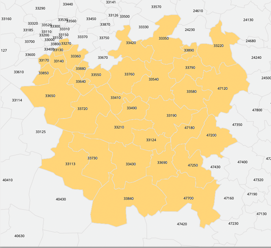 Nous livrons nos croquettes et nos conseils en Gironde Sud, couvrant une large zone visible sur la carte à droite. Les zones colorées en jaune indiquent les codes postaux où nous intervenons régulièrement, notamment dans des villes comme La Réole, Langon, Marmande, Bazas, Cadillac, et leurs environs.